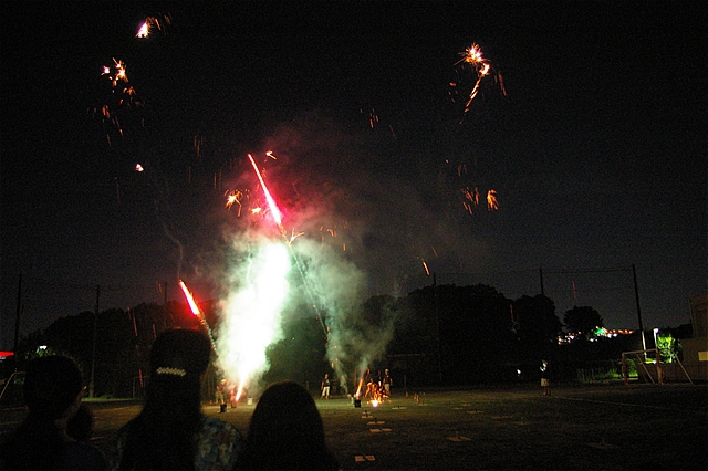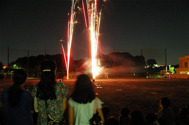体育館での遊びを堪能し、お化け屋敷で様々な恐怖を味わい、やっと日中の暑さが和らいだ校庭で涼みながら、締めくくりのイベントである打ち上げ花火”ドラゴン””ナイアガラ”などゆっくりと楽しんでおりました。 |