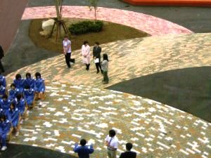 2010年9月に完成した中学校の「奏での庭」 泥んこだった校庭は、虹をイメージしたレンガに 中学生が企画して出来あがった |