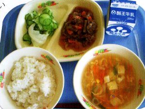 2010年夏 村内産100%の給食にチャレンジ 米と野菜はもちろん 、牛乳や味噌も村内産 飯舘牛の牛丼やハンバーグ、米粉パン、 米粉麺の「フォー」などバラエティに富んでいる |