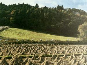 牧草地(上)と稲刈りを終えた田(下) 牛の寝床などに使う稲わらが芸術的に並んでいる 全村避難のあとは、雑草が生い茂っていた |