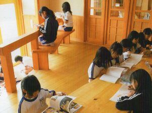 飯樋小学校はユニークなデザインの 木造校舎 校舎内で木登りもできる 思い思いの姿勢で 本を読んでいる子どもたち |