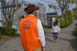 川和東小学校学援隊は、登校の見守りをしているグループである。メンバー10数人のうち女性は3人で、ほとんどが男性だ。「児童の見守りを始めたきっかけは、なんだったのですか」 「わが家は娘夫妻家族と同居していますが、いちばん下の孫が小学生になったころ、孫の通学の見守りをしていたんです。そんなときPTAの方から『学援隊に入ってくれないか』と声をかけられました。それ以来、15年ぐらいになります」 「ほぼ毎日通学路に立っていると聞きましたが、朝は早いんでしょうね」 「月に1~2回のゴルフと年に1度の健康診断以外は、休んだことがありません。学校は8時25分に始まります。8時頃がピークですが、7時半には立つようにしています。6時半に犬の散歩をすませ、朝食をとってから出かけます」 「羨ましいほど健康的な生活を送っていますね」 「おかげさまで健康保持に役立っているし、なにより楽しいのは子どもたちとの触れ合いです。毎朝の会話と笑顔からこちらが元気をもらってます」 ![]() 「対価を求めてやっているわけではありませんが、交通安全協力者として横浜市学校保健大会から「楯」をもらったり(平成24年度)、交通安全対策協議会から表彰状(平成29年度)をもらいました。やはり嬉しいですよ」 「川和東小学校の卒業式や入学式や運動会には、メンバー全員が来賓として招かれるんです。学援隊は個々の場所で見守っているので、ふだんはあまり会いません。隊員みんなで会うのは卒業式の後で開く宴会ぐらいなんです」 「卒業式で思い出しました。北さんに聞いたのですが、見守りをしている卒業生には"Have a Dream"のサインと”夢”の墨書の手作りカードを送っているそうですね。残っていたら見せてください」 「ここを通る6年生の人数は年によって違いますが、30枚程度用意します。みんな喜んでくれますよ」と言いながら、カードを見せてくれた。 ちなみに、川和東小学校の校区は、富士見が丘、見花山、高山、二の丸、川和台、葛が谷、加賀原一丁目の一部、加賀原二丁目の一部。児童数は約1,000名。以前は1,200名のマンモス校だったが、今は減少気味だという。