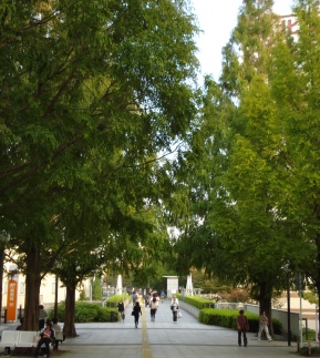 「都筑区にどんな印象をお持ちですか」のありきたりの質問に「ひとことで言うと、穏やかな区。また、駅から役所に行くのに、信号も横断歩道もないのは都筑区だけですよ。他の区では考えられません」の嬉しい答えが返ってきた。区長に言われるまで気づかなかったが、たしかに「センター南駅」から区役所までの道は、車の往来がなく、安心して歩くことが出来る。左写真は区役所から駅へ向かう歩道。乳母車も車いすも杖をついている人も、のんびり通っている。 「緑が多いことも気に入っています。でも緑地は年々減っているんです。農地や山林のほとんどは個人が所有していますが、彼らがそれを売って宅地や大きなビルにしたいと言えば、防ぎようがないのです。緑地を守るには、横浜市がその土地を買いとればいいわけです。その財源確保のために、前職で横浜みどり税の制度を新しく作りました」と、緑地確保の必要性を熱く語り出した。 区長になる前は、環境創造局で自然保護に努めてきた。それだけに、民間所有の緑地が減っていくことを黙って見ているわけにはいかなかったという。 「緑が多くて住みよい区ですねえ」に終わらず、次なるステップの話を聞けたことは、思わぬ収穫だった。地主の気持ちひとつで緑地が減ってしまうなど考えたこともなかった。先手を打っての「みどり税」も仕方がないような気がしてきた。