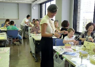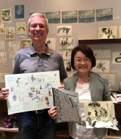 「水谷さんが都筑区に越してきたのはいつですか。居場所作りの活動をはじめたきっかけは何だったのでしょうか」 「越してきたのは約30年前。まだ都筑が誕生していない頃です。1998年、20年前に北山田小コミュニティハウスの依頼を受けて”対話によるカウンセリング勉強会”を開きました。その後このグループで”アーモンドの会”を立ち上げました。都筑区の人口が増えるにつれ、生きづらさを抱えた子どもや青少年、外国籍の方が増えてきたのです。カウンセリングの活動が認められ、社会福祉協議会や横浜市の依頼で講演の機会も多くなりました。こうして活動の場が広がり、2012年のNPO法人設立にいたりました」 「若い頃から関心があったのでしょうね」 「高校生の頃から実際に英語が使えるようになりたいと、英語学校にも通いました。その後ドラマメソッドという、演劇理論を通して英語を教える仕事につきました。その学校は当時として珍しく、同じクラスに自閉症の子が1割ぐらい在籍。最初は戸惑いましたが、障がいのある子・ない子という垣根を取り払って教育したほうがいい事 「クリスチャンの私が通っていた教会は、カウンセリングにも力を入れていました。いろいろな困難を抱えている人の相談にもたずさわってきたのです。この経験が今の私の活動の原点ですね」 「ところで、ご主人は活動に理解ありますか」 「もちろん!彼はACNの副理事です。アメリカ人ですが、国際基督教大学で日本近・現代史を教えているんですよ。彼も異文化の中でコミュニティ作りに悩んだことがあります。だから横浜の歴史・文化を通じて市民の意識を高めることの活動にも熱心なのです」 ツーショット写真は、凸凹コミュニティアートプロジェクト行事のひとつ、「横浜の北部の民話に聴く-民と族の間に挟まれて-」の講演をなさった時のご主人のロバート・エスキルドセン氏と水谷さん。後で知ったのだが、Almond English Cafeの講師はご主人。