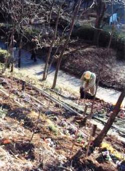 清水さんがニュータウンに居を構えたのは、区画整理の仕事が終わって数年後のことだ。知り合いになった地元の不動産屋に勧められて、茅ヶ崎南に宅地を求めた。 そうなると、区画整理の頃からの知り合いが、ほってはおかない。町内会の役員を経て、3年前から勝田茅ヶ崎地区連合町内会の会長を、本人の弁によれば「やらされている」。 役所と町内会のありかたに矛盾を感じつつも、仕事を通じての旧住民に加え、新住民との付き合いも広くなった。「おかげで、人脈も視野も広くなりました。思わぬ出会いもたくさんあります」と、嬉しそうだ。 「茅ヶ崎公園愛護会」の会長も引き受けている。この愛護会は平成7(1995)年に結成。。茅ヶ崎公園は、人工的に整備された遊具などが置いてある広場ではない。雑木林・竹林・池・せせらぎなどの自然を、できるだけ当時のままに残してある。清水さんら公園愛護会のメンバーは、下草刈り・落ち葉の清掃・樹木や竹林の保全以外に、新たに花壇を作る作業(左)もしている。 作業をしていると、公園を散歩している人から声をかけられることが多い。東京横浜独逸学園が近いせいか、ドイツ人と話すこともある。こうして新たな出会いが生まれることもあれば、愛護会に入会してくれる人も出てくる。 公園内の日本庭園と清流は、平成19年度の「ヨコハマ市民まち普請事業」のコンテストに選ばれて、復元した。 男冥利につきる区画整理の本職を終えたあとも、自分が関わった地に暮らし、地域住民の和に心をくだき、崩れゆくニュータウンを食い止めようと努力している。 「こんな方が都筑に住んでくれていて本当に良かった」と思える訪問になった。「いつまでもお元気で」と願わずにはいられない。