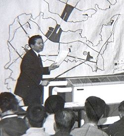 「今、こうして地域で活動しているのも、そもそもは60年前のアルバイトにあるんですよ。運命の出会いかもしれません」と語り出した清水さん。 学生時代に、六本木(東京都港区)の区画整理現場でアルバイトをしていた。六本木の墓地を烏山(世田谷区)に移転する事業に関わり、たくさんの人と交わってきた。 学生時代のアルバイトが、のちに港北ニュータウンで区画整理を担当する仕事につながった。「区画整理といえば清水さん」と言われるほど、その道の名人になったきっかけが、学生時代のアルバイトだったことは面白い。 昭和30(1955)年に、日本住宅公団(現在の都市再生機構)が発足。発足と同時に、東京都区画整理事務所から公団に転職した。昭和50(1975)年に、港北ニュータウン開発局に配属された。ニュータウン計画の経過は次の項で述べるが、工事着手は清水さんが配属される1年前のことだ。 およそ5600名の地権者全員の了解を得られないことには、計画は進まない。清水さんは、何度も説明会を開いて根気よく説得にあたった(左)。40歳半ばだけに、お若い! 地権者全員の換地(自分の土地を手放して他の地に移転)が終了したのは、昭和56年。6年間にわたり、区画整理と住民の交渉を献身的にこなした。 「もし大規模な区画整理をしなければ、今のような利便性の高い町は生まれなかったんですよ。区民は、このことをぜひ知ってもらいたい」と熱く語る。 その頃知り合いになった大地主や小宅地の人たちとの交流が今でも続いている。「町内会活動にスムーズに入れたのは、区画整理のベースがあったからなんです。○○ちゃんと呼べる人が大勢いるんですよ。そのころの人脈のおかげで、今があるんです」と、楽しそうに話す。