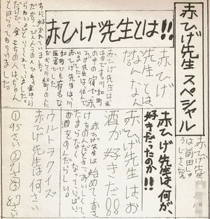 川和小学校の4年生が郷土学習の一つとして、城所清さんから赤ひげ先生の話を聞いた。その話をクラス全員が1ページを分担して、文集として冊子にしてある。どの生徒のページも率直で面白かったが、ある生徒の文をコピーさせてもらった。今は34~35歳になっているだろうが、本人を見つけて承諾を得るのは難しいので、名前はボカシておいた。 小学生に感銘を与えた城所清さんから、直接話を聞きたいと思ったが