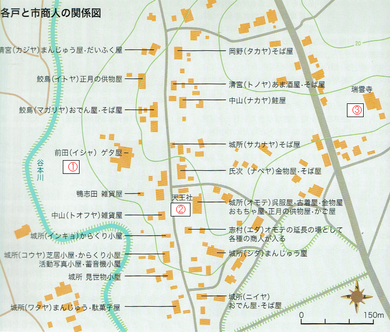 グリーンライン「川和町駅」の西側に、かつて「川和宿」と呼ばれた集落があった。「宿を通る八王子道(鎌倉街道ともいう)は、東海道と甲州街道を結ぶ大切な役割を担っていた。享保3(1719)年の文書にも川和宿の名が出ているので、重要な宿場であったのは確かだろう」と、「川和の歴史―川和中学校発行」の中で鈴鹿正和先生は書いている。 この「宿」で開かれる市は近隣に知れ渡っていて、特に12月25日の「歳の市」は、一歩進むのさえ大変だったほどの大混雑だったという。90歳ぐらいの数人が、子どもの頃の思い出として話してくれた。 「川和の市」の詳細は別な機会に取り上げたいと思うが、前田医院はこの川和宿の中にあった。 下の地図は「図説 都筑の歴史」の川和の市について、秋山満さんが作成した「各戸と市商人の関係図」を利用した。 市商人は川和の市の時に、八王子道沿いの各戸の前庭を借りて店を開いた。サカナヤ、トオフヤ、ナベヤなどの屋号は、当時の店に関係しているのだろう。 ![]() この地図にある家はほとんど残っている。大きな違いは各戸の前庭に家が建ち、新住民が増えたことだ。以前の「宿」の面影はほとんどないが、別な意味で発展を感じる。かつての前田医院(前田医者と呼ぶ人が多かった)の真ん前にあるサカナヤとナベヤの主と庭先で話したのだが、屋号は今でも使っているそうだ。