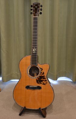 「アニメーター学院の次は何を始めたんですか」 「恵比寿にあるアミューズメントメディア総合学院にやはり新聞奨学生として通いました。ノベルズライター科でシナリオライターになるための文章力の訓練です。演出家に気に入られて、お笑いプロダクションを紹介すると言われたのですが、訪ねてみるともぬけの殻。プロダクションがつぶれたんです」 「ドラマを見ているみたい」 次は目白のテアトルアカデミーに2年通いました。音楽関連の養成コースもありましが、メインは役者の養成だったので最初は役者向けのレッスンを受けていました。その一方で、ライブハウスでアコースティックギターの弾き語りをしていたんです。ギターは高校の頃からの独学です」「やっと音楽に近づいてきましたが、まだ福祉施設には関わってませんね。 「バイト先で知り合った友だちの弟が脳障害で川崎養護学校に通っていたのですが、その弟が亡くなりました。ご家族は養護学校にお礼をこめてクリスマス会を提案。友だちはアルトサックスのライブをしたかったのですが、ひとりでは自信がないので、セッションを依頼されました。みなさんがとても喜んでくれて、大好評でした」 「そんな時、知り合いに紹介されたのが、横浜福祉研究所(グループホームを運営しながら認知症を研究する会社)の役員です。その施設の内覧会の日にBGM演奏をすることになったのです。考えてみると、この日2003年4月が、音楽療法を始めた記念の日。介護保険制度が出来た頃です」 「横浜福祉研究所の朗読劇(キョーメイションワークショップSOULTRAIN)では作曲とギター演奏を担当しました」 写真は、中川さん愛用のアコースティックギター。普通のギターと違うのはアンプがついているので音量が高い。