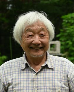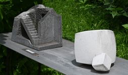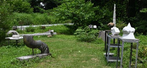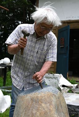 作業場の庭は「彫刻の庭」として、誰もが見学できる。緑の中に置かれた石の彫刻は、わが都筑の緑道を思わせる。 「原村に居を構えたのはなぜですか」 「東京の稲城にいたのですが、石彫は音もうるさいし埃も出ます。30年前に移住しましたが、この辺りには芸術家がたくさんいるので快適です」 「どのようにして彫るのか見せてください」と頼んだら、覆いをとって制作中の石にノミを入れてくれた。訪問前の気難しい方だったらどうしようの心配は、杞憂に終わった。 「これは青鍋石です」 「福島県の三春産ですね」と言ったら「よく知っている」と感心された。 「緑道に置かれた12支の石が青鍋石なんです」 「そうでしたね。あれを作ったのはSさんとAさんです」 下の写真は原村のアトリエ。「彫刻の庭」の名にふさわしく、たくさんの作品が庭に置いてある。筆者は、階段のある作品が特に気に入った。
