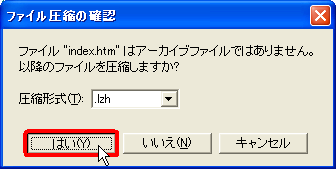 圧縮の確認のダイヤログが開きますのでLZHを選択して[はい] ボタン をクリックします。