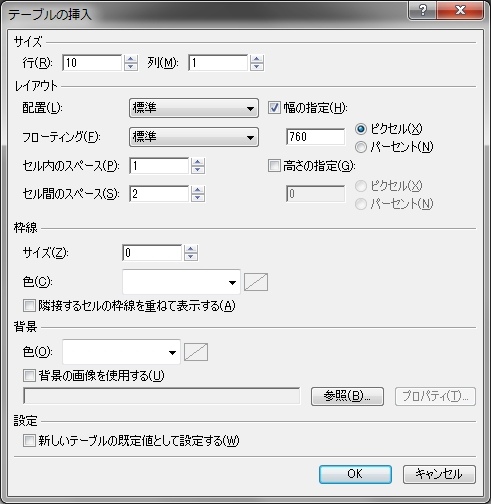 行を10、列を1 幅の指定 760ピクセルを入力して「OK」を押す |