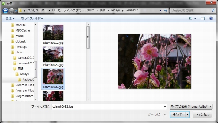| 自分のパソコンの内部を表示されるので、必要な画像を選択して「挿入」をクリックする |