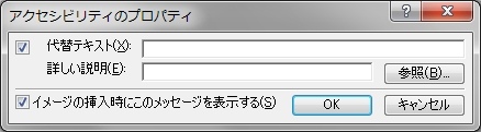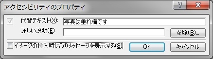 | 「アクシビリティのプロパティ」ダイアグラムが表示されるので「代替えテキスト」に写真の内容を入れる。 |