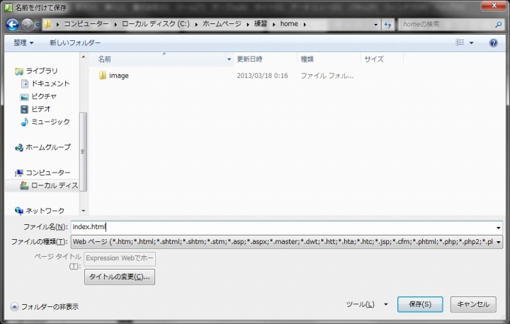 | 作成したページを保存する。「ファイル」→「名前を付けて保存」をクリックすると下記の保存場所が現れるので、場所を決定する。ファイル名をindex.htmlとする。(必須)2ページ以降は別名にする 「保存」をクリックする |