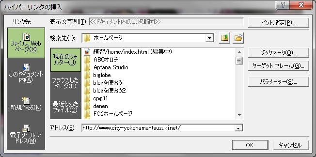 | 下記のようなダイアグラムが表示されるので、アドレスの場所にリンク先URLを貼り付ける。そして「OK」を押す 例:http://www2s.biglobe.ne.jp/~ouji/ |